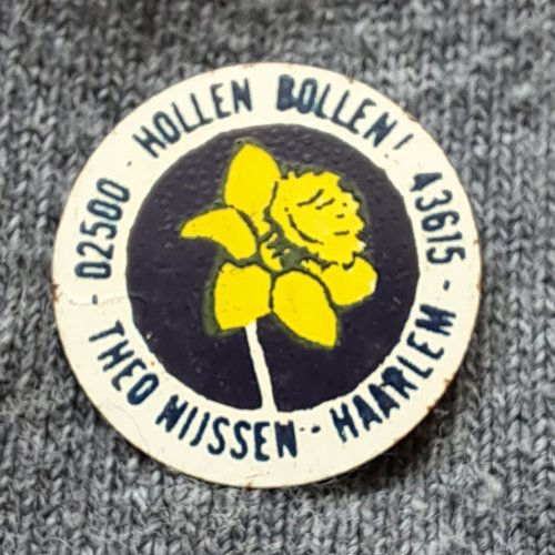 Theo Nijssen / Haarlem / Holle Bollen / 02500 43615 (narcis) [geel-zwart-zwart]Achtergrond: Wit, Blik / Metaal, Bloemen, Gebruikt, Nederland, Opdruk: Zwart