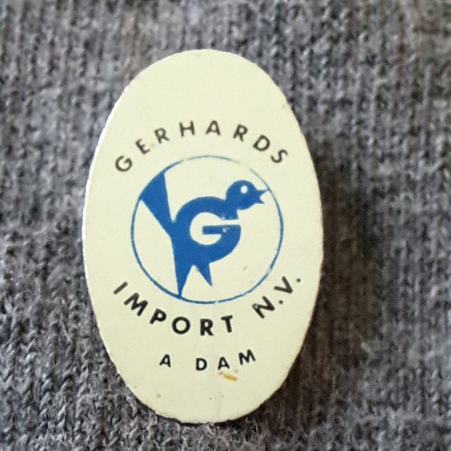 Gerhards import n.v. A’dam [blauw]Achtergrond: Wit, Blik / Metaal, Gebruikt, Nederland, Opdruk: Zwart, VogelAmsterdam