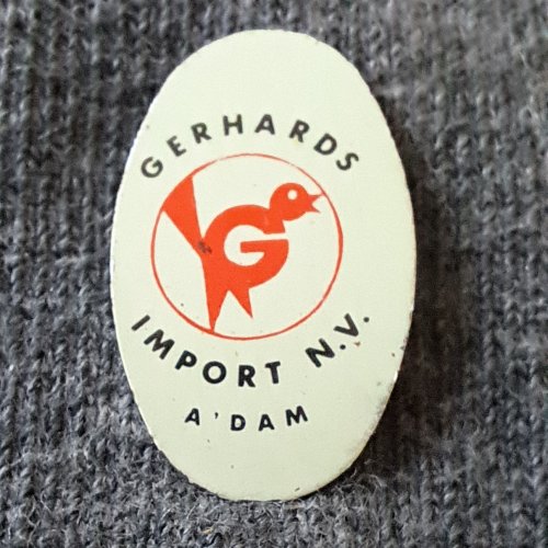 Gerhards import n.v. A’dam [rood]Achtergrond: Wit, Blik / Metaal, Gebruikt, Nederland, Opdruk: Zwart, VogelAmsterdam