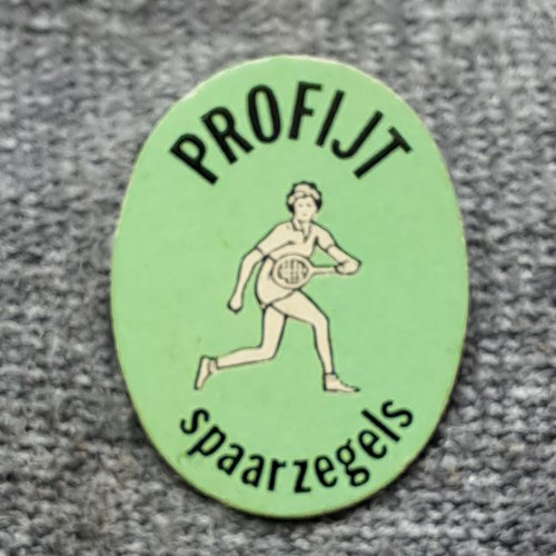 Profijt spaarzegels (tennis)Achtergrond: Groen, Blik / Metaal, Gebruikt, Nederland, Opdruk: Zwart, Sporter, Tennis