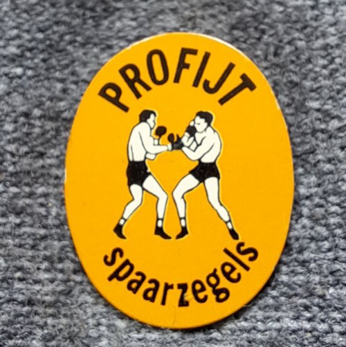 Profijt spaarzegels (boksen)Achtergrond: Oranje, Blik / Metaal, Boksen, Gebruikt, Nederland, Opdruk: Zwart, Sporter