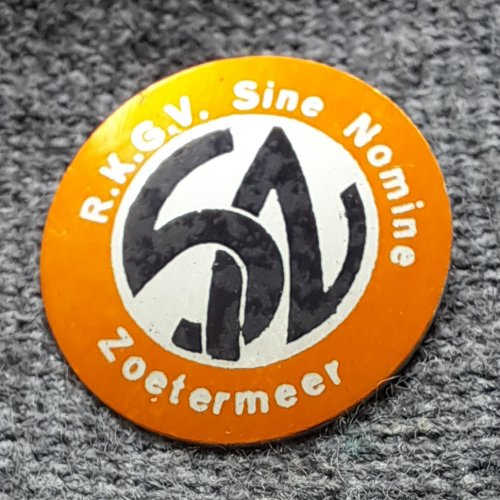 R.K.G.V. Sine Nomine SN ZoetermeerAchtergrond: Oranje, Achtergrond: Zilver, Blik / Metaal, Gebruikt, Nederland, Opdruk: Zilver, Opdruk: Zwart, Sport en spelRoomskatholieke gymnastiekvereniging