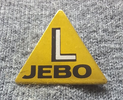 L JeboAchtergrond: Goud, Blik / Metaal, Gebruikt, Nederland, Opdruk: Wit, Opdruk: ZwartRijschool / Letter
