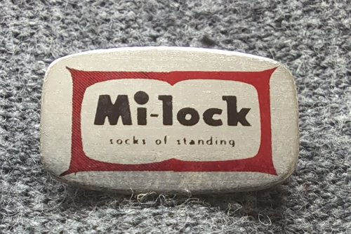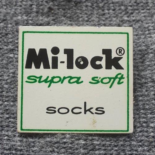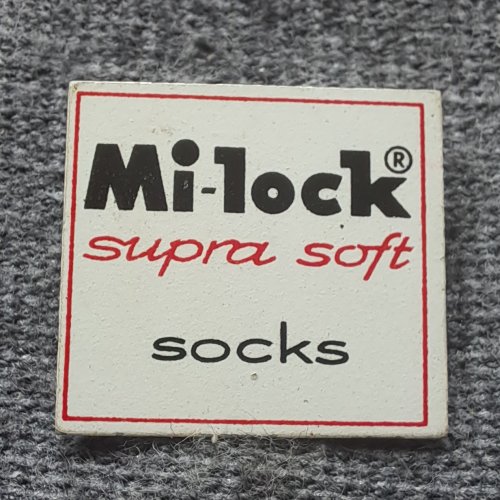 Mi-Lock socks of standingAchtergrond: Zilver, Blik / Metaal, Fashion, Gebruikt, Nederland, Opdruk: ZwartTextielfabrieken Emile Lockefere / Hulst