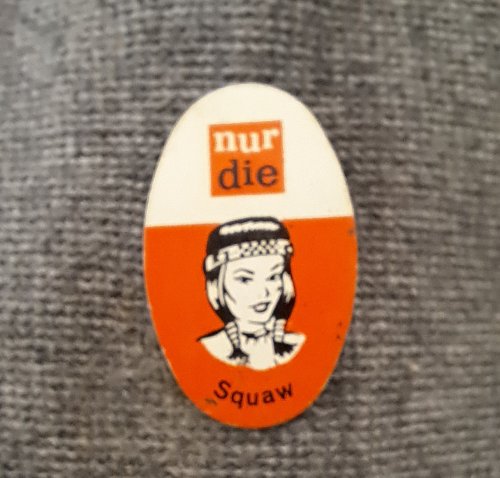 Nur die – SquawAchtergrond: Oranje, Blik / Metaal, Gebruikt, Indiaan, Nederland, Opdruk: Wit, Opdruk: Zwart