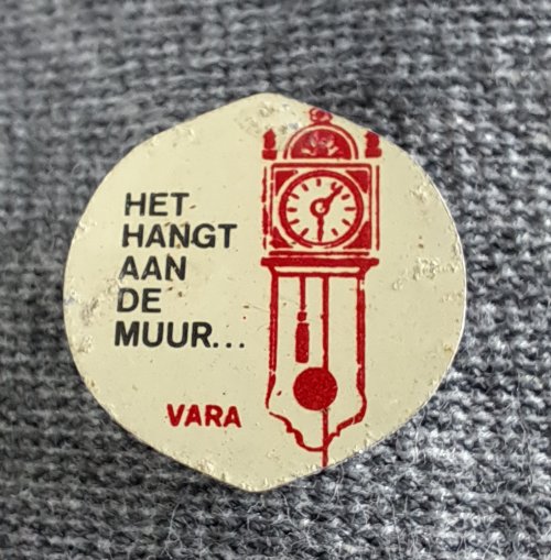 VARA Het hangt aan de muur …Achtergrond: Wit, Blik / Metaal, Gebruikt, Nederland, Opdruk: Rood, Opdruk: Zwart, Radio en tvKlok / Pendule