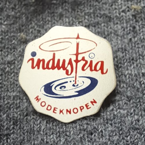 Industria modeknopenAccessoires, Achtergrond: Wit, Blik / Metaal, Gebruikt, Nederland, Opdruk: RoodKnoop / naald / garen