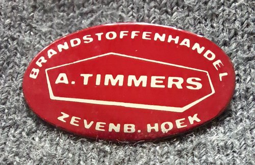 Brandstoffenhandel A. Timmers Zevenb. HoekAchtergrond: Rood, Blik / Metaal, Brandstof / Energie, Gebruikt, Nederland, Opdruk: ZilverZevenbergsche