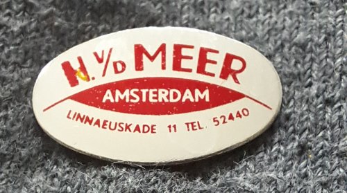 H. v/d Meer Amsterdam / Linnaeuskade 11 / tel 52440Achtergrond: Rood, Achtergrond: Zilver, Blik / Metaal, Gebruikt, Nederland, Opdruk: Rood, Opdruk: Zilver