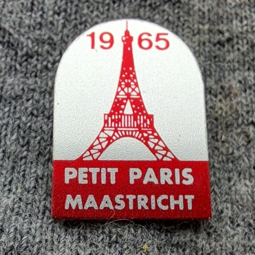 Petit Paris Maastricht 1965Achtergrond: Rood, Achtergrond: Zilver, Blik / Metaal, Gebouwen, Gebruikt, Nederland, Opdruk: Rood, Opdruk: ZilverEifeltoren