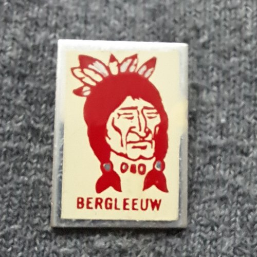 Bergleeuw [rood op wit]Achtergrond: Wit, Blik / Metaal, Figuur / persoon, Gebruikt, Nederland, Opdruk: Rood