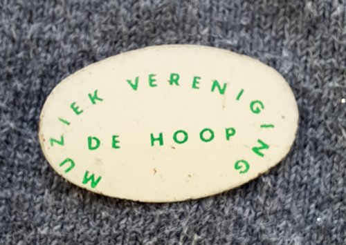 Muziekvereniging De Hoop [groen]Achtergrond: Wit, Blik / Metaal, Gebruikt, Muziek, Nederland, Opdruk: Groen