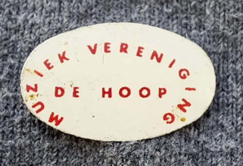 Muziekvereniging De Hoop [rood]Achtergrond: Wit, Blik / Metaal, Gebruikt, Muziek, Nederland, Opdruk: Rood