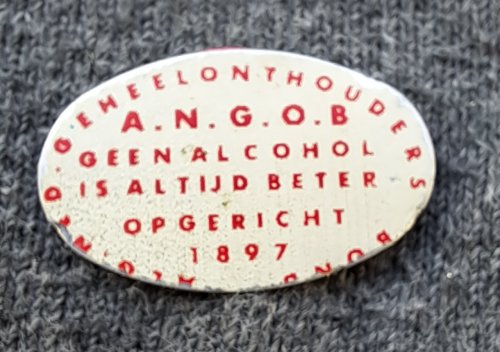 Alg. Ned. GeheelOnthouders Bond / A.N.G.O.B / Geen alcohol is altijd beter / opgericht 1897 [rood]Achtergrond: Wit, Blik / Metaal, Gebruikt, Nederland, Opdruk: RoodANGOB