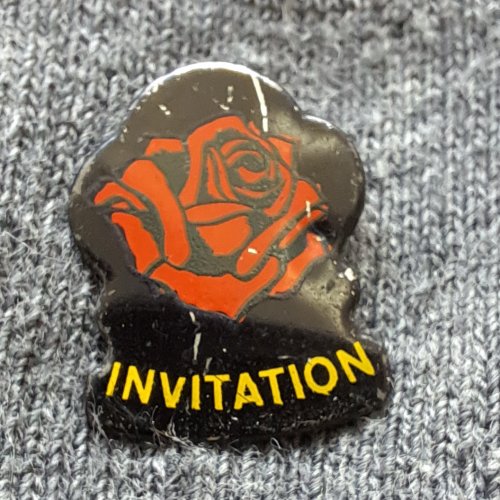 Invitation (roos) [rood]Achtergrond: Zwart, Blik / Metaal, Bloemen, Gebruikt, Nederland, Opdruk: Geel