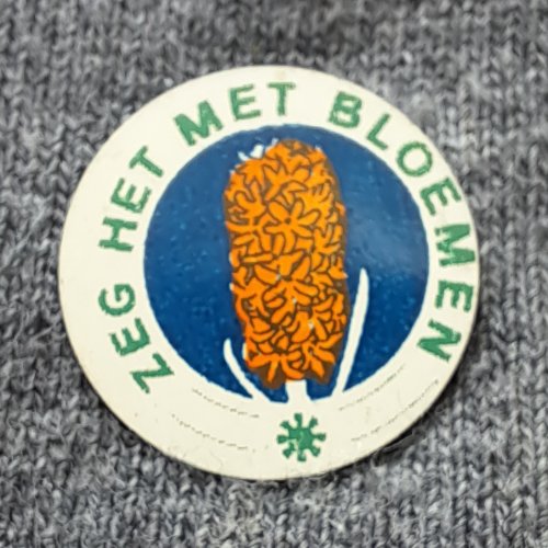 Zeg het met bloemen (hyacint) [oranje-blauw-groen]Achtergrond: Wit, Blik / Metaal, Bloemen, Gebruikt, Nederland, Opdruk: Groen