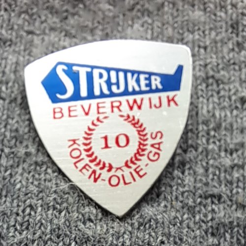 Strijker Beverwijk 10 kolen olie gasAchtergrond: Blauw, Achtergrond: Zilver, Blik / Metaal, Brandstof / Energie, Gebruikt, Nederland, Opdruk: Rood, Opdruk: Zilverjubileum