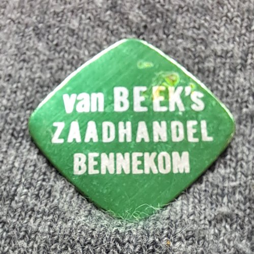 van Beek’s zaadhandel Bennekom [groen]Achtergrond: Groen, Blik / Metaal, Gebruikt, Nederland, Opdruk: Zilver