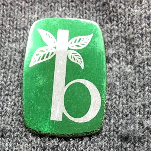 B met vier bladeren in de vorm van wiekenAchtergrond: Groen, Blik / Metaal, Bloemen, Gebruikt, Onbekend, Opdruk: ZilverLetter