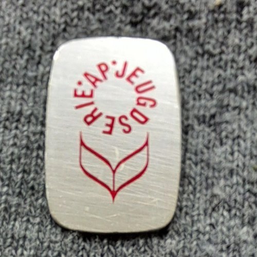 Turnringen [geel met rood]Achtergrond: Geel, Blik / Metaal, Gebruikt, Nederland, Opdruk: Rood, Ringen, Sporter