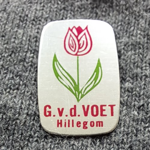 G. v.d. Voet Hillegom (margriet) [blauw]Achtergrond: Blauw, Blik / Metaal, Bloemen, Gebruikt, Opdruk: Geel