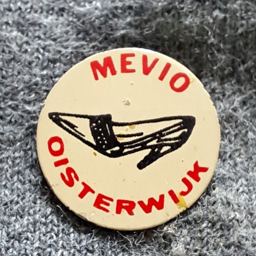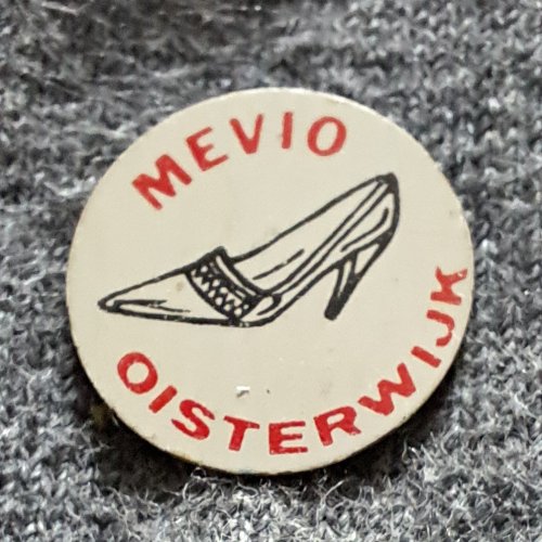 Mevio Oisterwijk (type-1) [wit]Achtergrond: Wit, Blik / Metaal, Gebruikt, Nederland, Opdruk: Rood, Schoenen