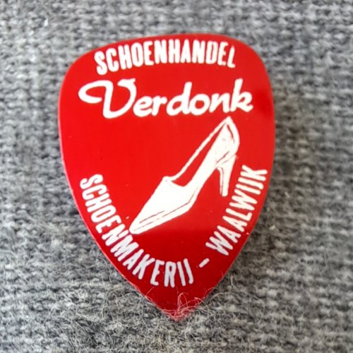 Schoenhandel Verdonk schoenmakerij – WaalwijkAchtergrond: Rood, Blik / Metaal, Gebruikt, Nederland, Opdruk: Zilver, Schoenen