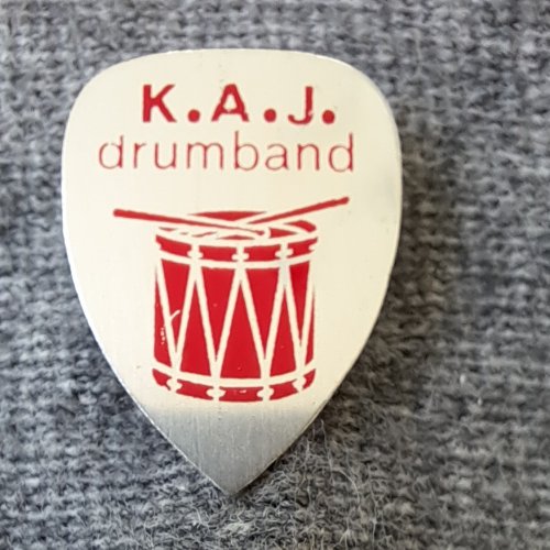 K.A.J. DrumbandAchtergrond: Zilver, Blik / Metaal, Gebruikt, Muziek, Nederland, Opdruk: RoodKAJ / Jeugdbeweging / Jeugdwerk / trommels