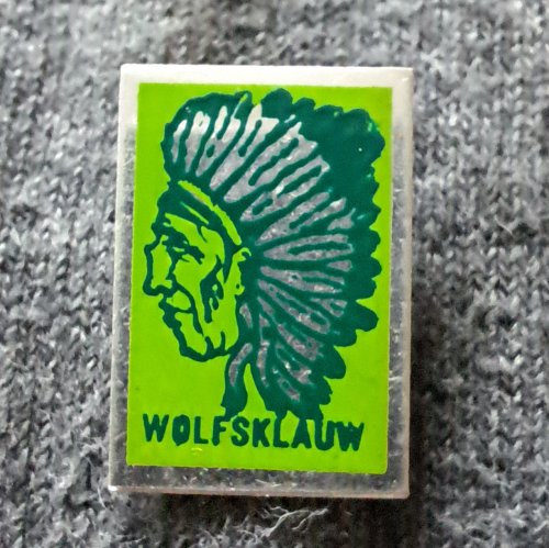 Wolfsklauw [groen met groen]Achtergrond: Groen, Blik / Metaal, Gebruikt, Indiaan, Nederland, Opdruk: Groen