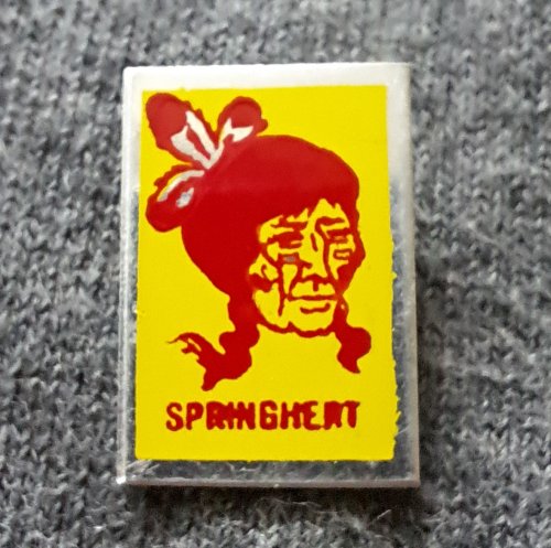 Springhert [geel met rood]Achtergrond: Geel, Blik / Metaal, Gebruikt, Indiaan, Nederland, Opdruk: Rood