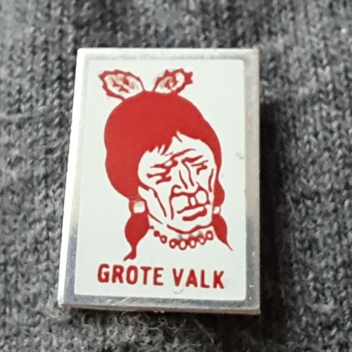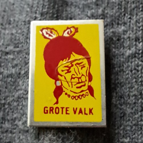 Grote Valk [geel met rood]Achtergrond: Geel, Blik / Metaal, Gebruikt, Indiaan, Nederland, Opdruk: Rood