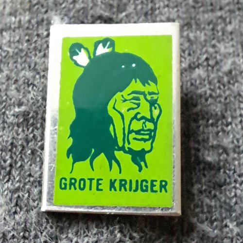Grote Krijger [groen met groen]Achtergrond: Groen, Blik / Metaal, Gebruikt, Indiaan, Nederland, Opdruk: Groen