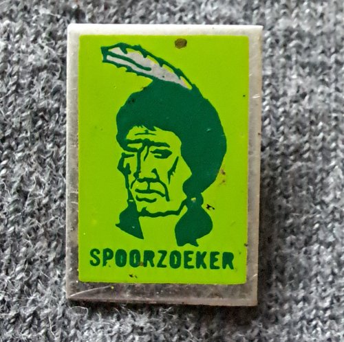 Spoorzoeker [groen met groen]Achtergrond: Groen, Blik / Metaal, Gebruikt, Indiaan, Nederland, Opdruk: Groen