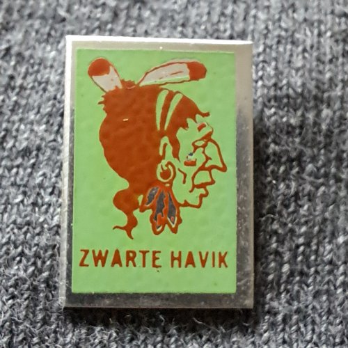 Zwarte Havik [geel met groenblauw]Achtergrond: Geel, Blik / Metaal, Gebruikt, Indiaan, Nederland, Opdruk: Blauw, Opdruk: Groen