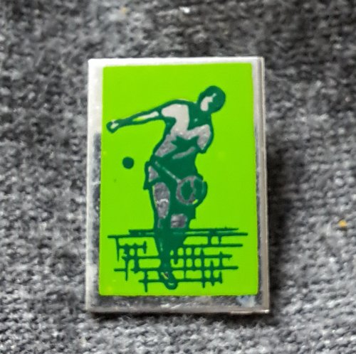 Kogelstoten [groen met blauw]Achtergrond: Groen, Blik / Metaal, Gebruikt, Kogelstoten, Nederland, Opdruk: Blauw, Sporter