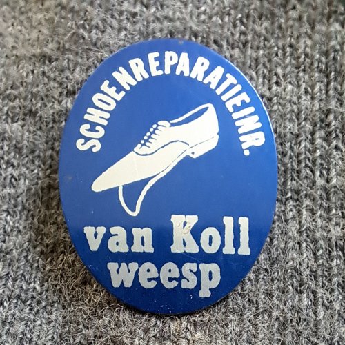 van Koll Weesp schoenreparatieinr.Achtergrond: Blauw, Blik / Metaal, Gebruikt, Nederland, Opdruk: Zilver, Schoenen