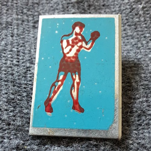 Boksen [blauw met rood]Achtergrond: Blauw, Blik / Metaal, Boksen, Gebruikt, Nederland, Opdruk: Rood, Sporter