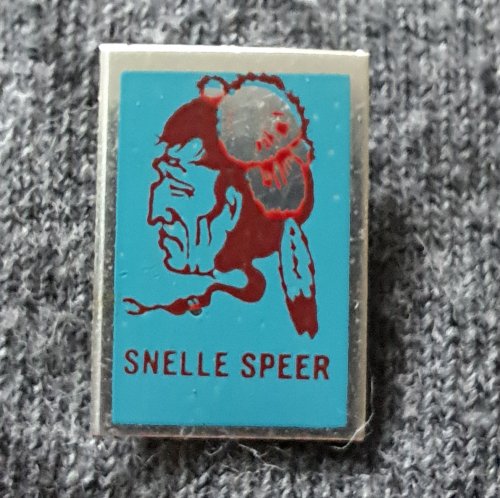 Snelle Speer [blauw met rood]Achtergrond: Blauw, Blik / Metaal, Gebruikt, Indiaan, Nederland, Opdruk: Rood