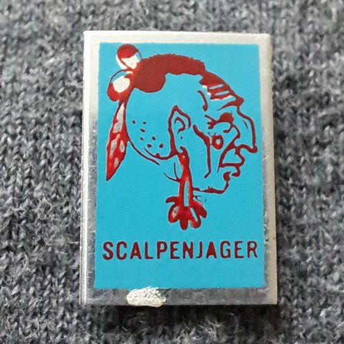 Scalpenjager [blauw met rood]Achtergrond: Blauw, Blik / Metaal, Gebruikt, Indiaan, Nederland, Opdruk: Rood