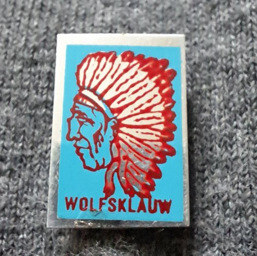 Wolfsklauw [blauw met rood]Achtergrond: Blauw, Blik / Metaal, Gebruikt, Indiaan, Nederland, Opdruk: Rood