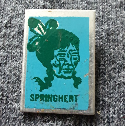 Springhert [blauw met groen]Achtergrond: Blauw, Blik / Metaal, Gebruikt, Indiaan, Nederland, Opdruk: Groen