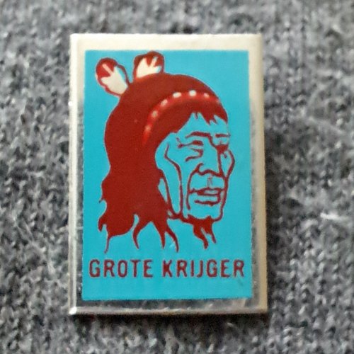 Grote Krijger [blauw met rood]Achtergrond: Blauw, Blik / Metaal, Gebruikt, Indiaan, Nederland, Opdruk: Rood