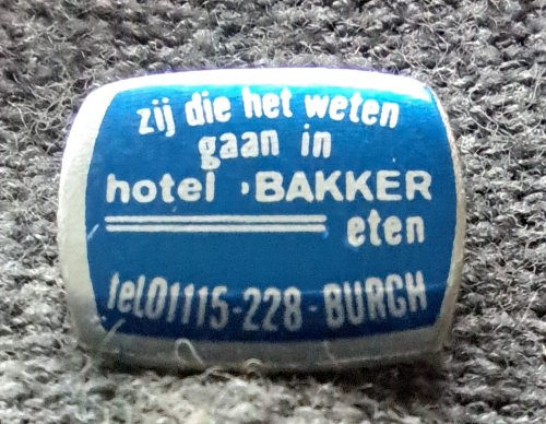 Zij die het weten gaan in hotel Bakker etenAchtergrond: Blauw, Blik / Metaal, Gebruikt, Horeca / uitgaan, Nederland, Opdruk: Zilvertel. 01115-228 – Burgh