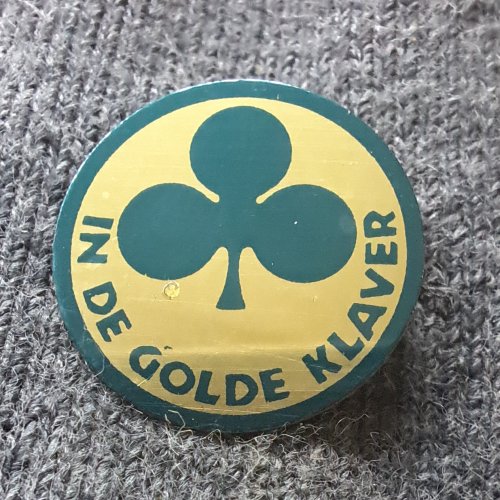 In de golde klaverAchtergrond: Goud, Blik / Metaal, Bloemen, Gebruikt, Nederland, Opdruk: BlauwKlavertje drie / Kledingwinkels / G. van Dijk / Kampen