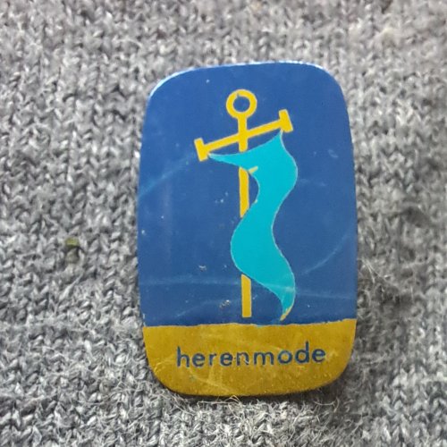 HerenmodeAchtergrond: Goud, Blik / Metaal, Dieren, Fashion, Gebruikt, Nederland, Opdruk: BlauwZeepaard / Anker / vaandel